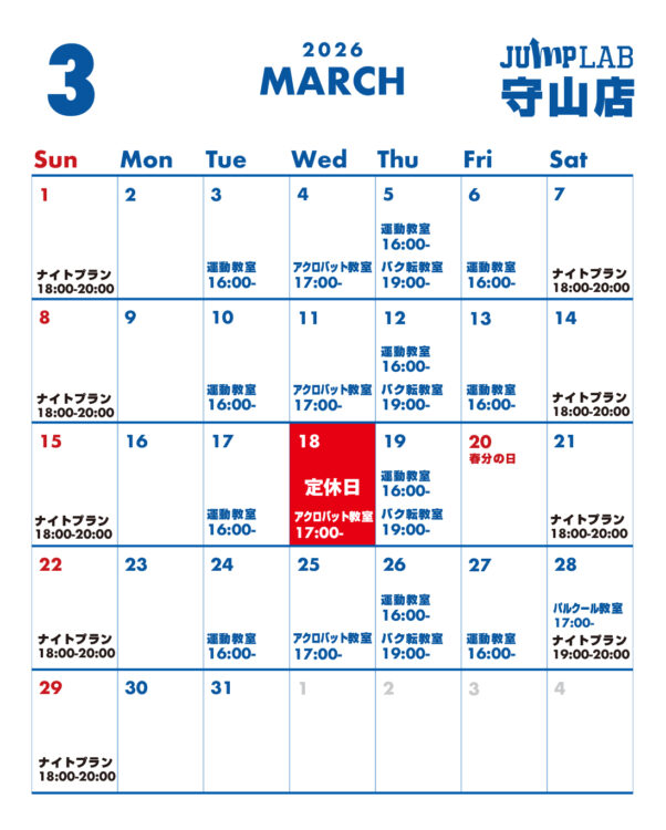 JUMP LAB守山店の2026年3月度スケジュールです!
