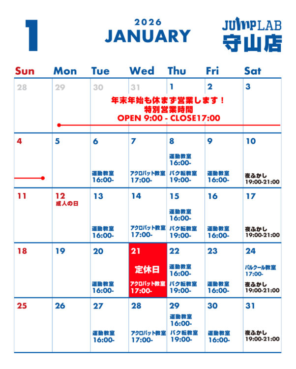 JUMP LAB守山店の2026年1月度スケジュールです!
