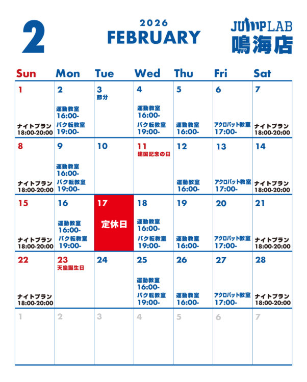 JUMP LAB 鳴海店の2026年2月度スケジュールです!